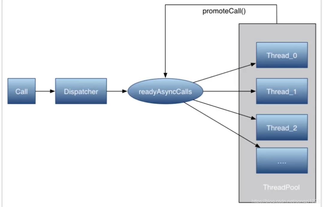 可以看到,Dispatcher的主要作用就是保存Call请求的各种状态,然后它又维护了一个线程池,用于执行网络请求。具体就是,这些call被一个个地发送给一个个的子线程来执行(异步请求,不是同步请求)。